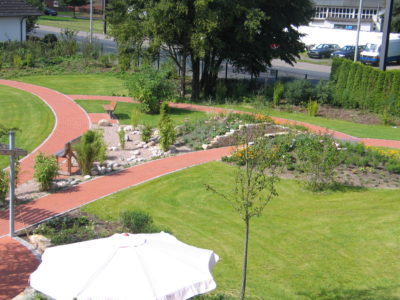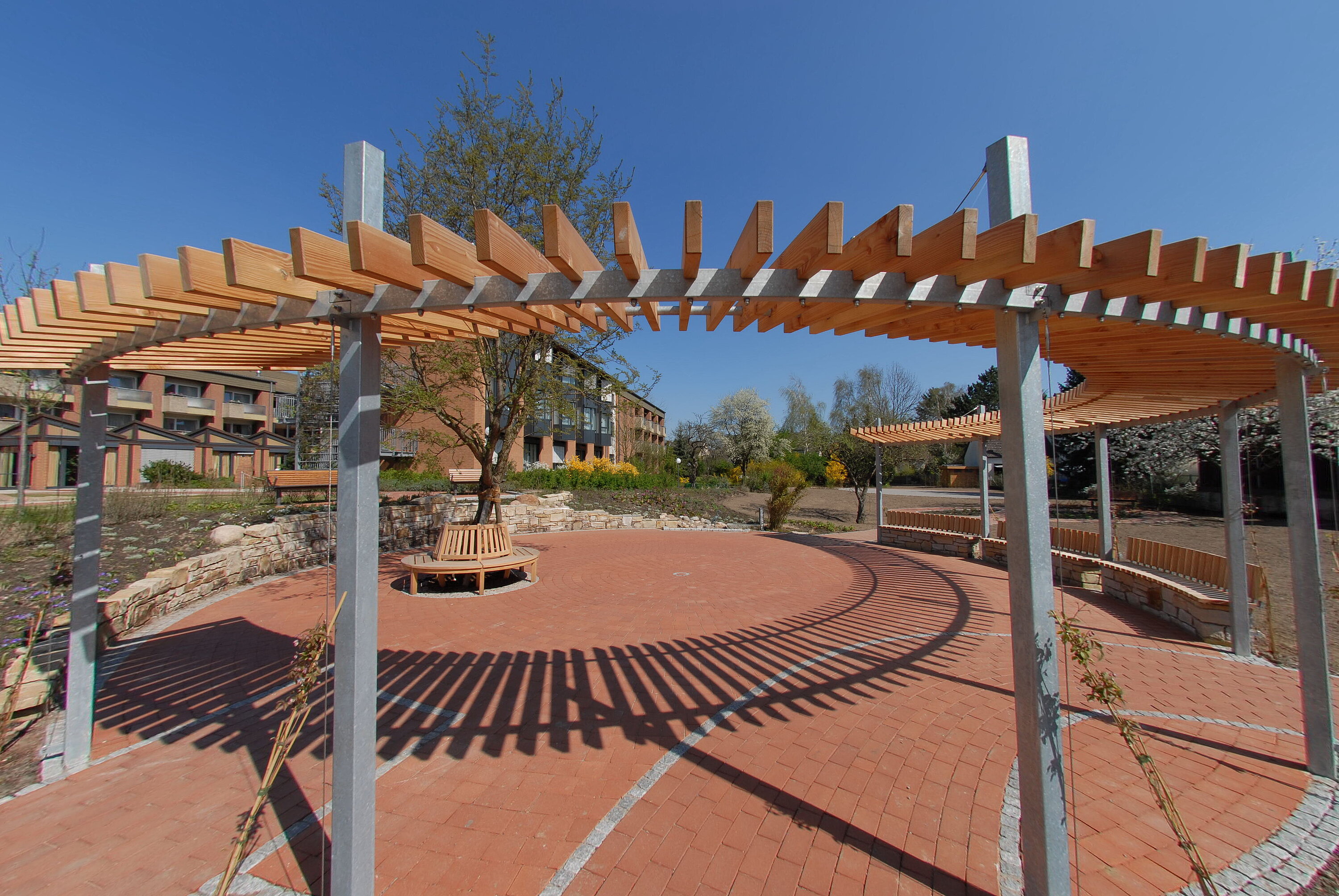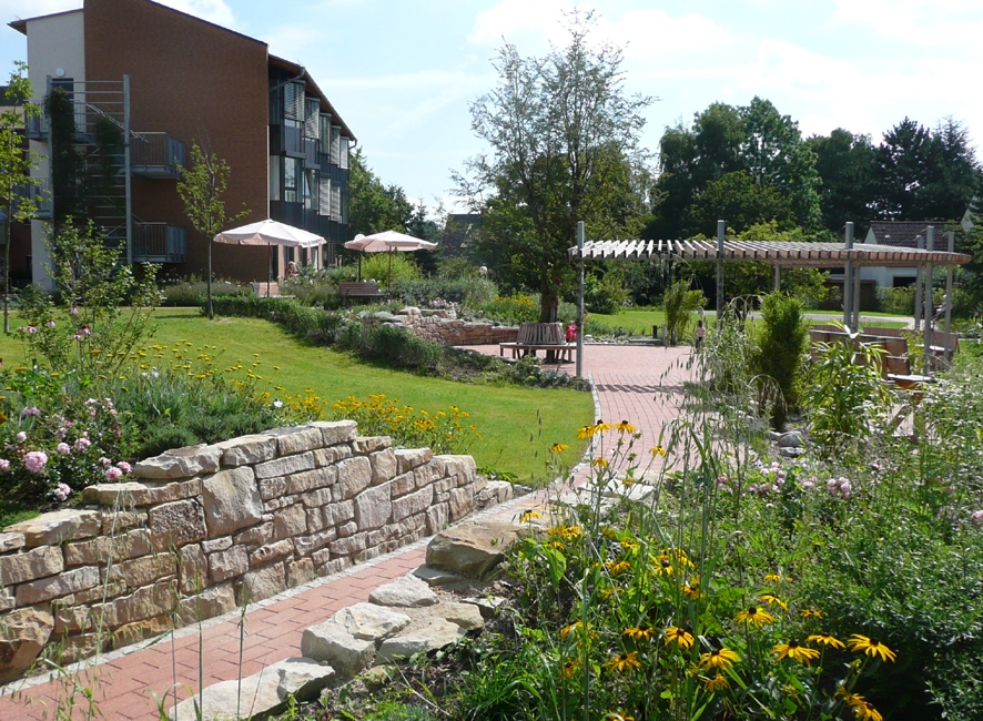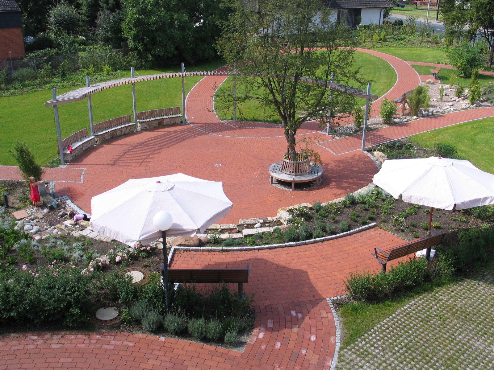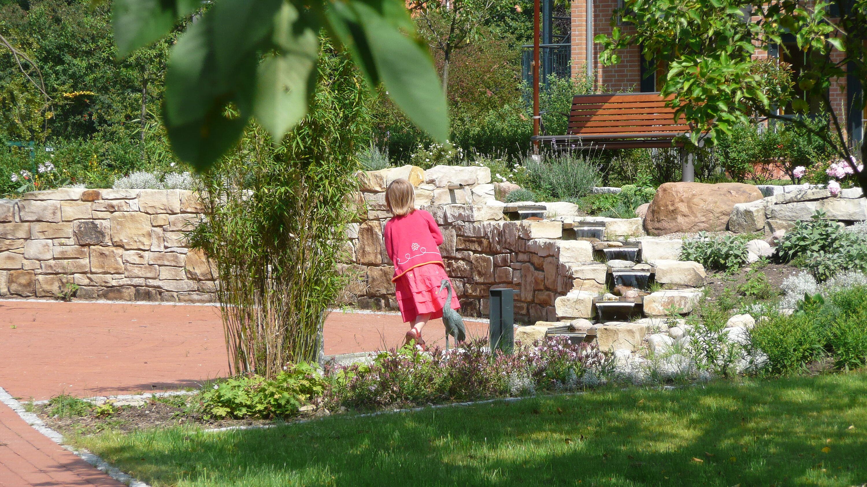 Wie ist es, mal wieder wie ein Kind die Beine baumeln zu lassen. Wie riecht eigentlich Lavendel oder welche Vögel kommen an den Brunnen zum baden oder trinken? Der Park für Bewohner eines Seniorenpflegeheims in Hannover gibt den Menschen Antworten. Kindheitserinnerungen werden durch Geräusche, Düfte und besondere Körpererfahrungen wachgerufen. In diesem Park enden die Wege nicht in Sackgassen, sondern sie führen immer wieder in die "belebte" Mitte zurück. Die überhohe Bank ist eine Station im Park, die Kräuterhochbeete liegen links und rechts des Weges und man muss nur die Hand ausstrecken und kann die Pflanzen berühren. An der Scheinbuche liegt der Brunnenplatz der Bouletreff ist nur wenig weiter...